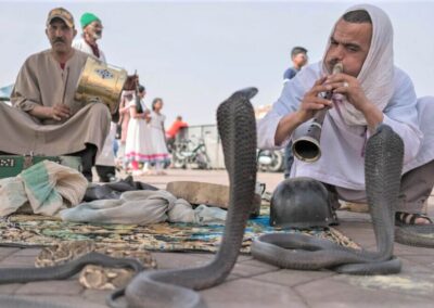 Discover the vibrant city of Marrakech, often referred to as the "Red City" due to its distinct red sandstone architecture. Stroll through the historic medina, a UNESCO World Heritage site, and be captivated by the bustling souks filled with aromatic spices, handcrafted goods, and traditional treasures. Marvel at the Koutoubia Mosque and its iconic minaret, find tranquility in the Majorel Gardens, and delve into history at the Saadian Tombs. Engage with the local culture at Jemaa el-Fnaa square, a pulsating heart of Marrakech, where you can enjoy a cup of mint tea and immerse yourself amidst street performers, musicians, free evening in marrakech